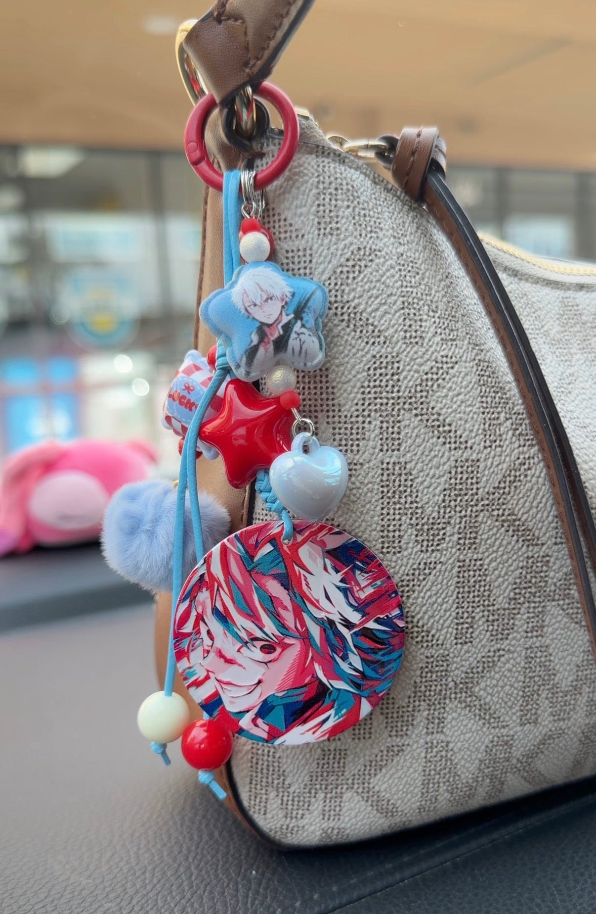 This handmade Sanemi-inspired keychain features a layered charm design with soft pastel beads, star accents, plush pom detail, and an illustrated anime badge centerpiece. The mix of bold red and calming blue gives the perfect âangry but protectiveâ aesthetic.